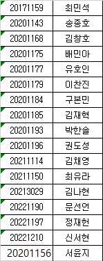 12월 03일 11시경까지 논문 및 대체물 제출한 학생 명단입니다.